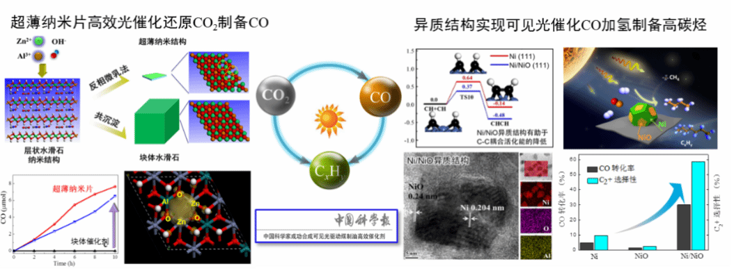 光催化技术被认为是解决能源问题的最有应用前景的技术之一。发展新型高效的光催化材料是该技术实用化的关键。水滑石基纳米结构材料因其电子结构可调、价格低廉等众多优势,而成为光催化领域的研究热点。近几年来,我们研究团队通过在水滑石表面引入缺陷结构增加活性位,增强了对反应物CO2、N2等的吸附和活化,进而提升催化活性。另外,通过构造界面活性位,调控中间物种的反应路径,从而实现高附加值产品的高选择性合成。
