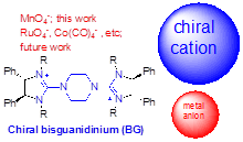 Phase transfer reactions using chiralcations and inorganic basic salts such as hydroxides and carbonates are but asub-set of a larger group of reactions known as chiral cation ion-pairingcatalysis. Herein, we report three reactions using chiral dicationicbisguanidinium ion pairs as catalysis; they are are each paired with threedifferent organometallic anions – permanganate, tungstate and molybdate. Theion pairs-catalyzed asymmetric oxidation of alkenes and sulfoxidationrespectively. In this new mode of cataysis, evidence suggests that rateacceleration is mainly attributed to transition state stabilization through attractivecation-anion interaction rather than enhancing solubility in organicsolvents.