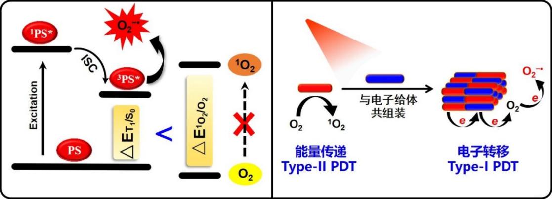 光动力治疗(PDT)是利用光敏药物(光敏剂)在光照下敏化分子氧产生的活性氧对肿瘤或感染性疾病进行治疗的一种治疗方法,由于其具有副作用小、特异性高以及不产生耐药性等优点而备受关注。根据敏化生成活性氧的机制不同,光敏剂可分为I-型和II-型光敏剂。在光照条件下,I型光敏剂和生物底物、分子氧通过多级的电子或质子转移生成活性氧自由基,而II-型光敏剂直接和分子氧通过三线态能量传递生成单线态氧(1O2)。目前已报道的光敏剂大多为II-型光敏剂,其对氧浓度高度依赖,而肿瘤组织固有的乏氧微环境会严重限制PDT疗效。与此不同,I型光敏剂具有良好的乏氧耐受性,即使在乏氧条件下,也可以发挥PDT疗效。然而,由于能量传递和电子转移的竞争,并且光敏剂往往更容易通过能量传递途径敏化分子氧生成1O2,目前缺少有效的策略来控制光敏剂通过电子转移而不通过能量传递敏化分子氧,使得I型光敏剂的设计开发极具挑战。针对上述问题,我们提出了两种构建I型光敏剂的策略,制备了两类基于BODIPY的I型光敏剂:1)通过合理的分子设计降低光敏剂的三线态的能量,使其不能与分子氧发生能量传递生成1O2,从而选择性通过I-型光动力途径生成超氧阴离子自由基[1];2)通过分子组装的方式引入电子给体或受体,促进光敏剂的电子转移效率,实现了II-型光敏剂到I-型光敏剂的转变[2-4]。