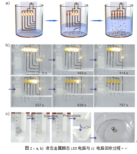 为了进一步验证该方法,研究人员还设计了一个可用于顺序关闭LED灯阵列的液态金属电路。实验中通过控制水的位置来逐步溶解PVA液态金属电路,实现按顺序关闭LED的控制(图2a-b)。研究人员最后通过实验室验证了PVA封装的液态金属瞬态电子的可回收性(图2c)。所制备的电路浸入水中可自动销毁,形成液态金属小液滴,通过添加低浓度的NaOH溶液,改变了液态金属的表面张力,液态金属小液滴可以快速融合成大液滴,极大地方便回收,金属的回收率高达%。
