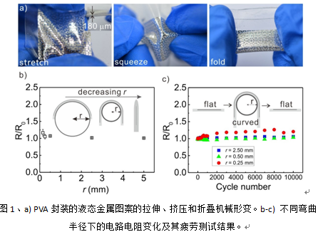 研究中采用真空辅助液态金属图案化和水雾辅助的封装方法,解决了在PVA中封装液态金属电路的难点。利用这种方法可以制备复杂的液态金属图案,且制备得到的液态金属瞬态可回收电路具有极高的机械和电学稳定性,可以在经受各种形变下仍然保持图案完整性。而且在高强度弯曲、扭曲下依然保持良好的导电性,在高达1万次的弯曲疲劳测试后,电路的导电性能也几乎不受影响(图1)。为了验证该方法,研究人员成功实现了多种复杂电路的设计,实现了基于液态金属电路的近场通讯、电容传感器等器件等应用。