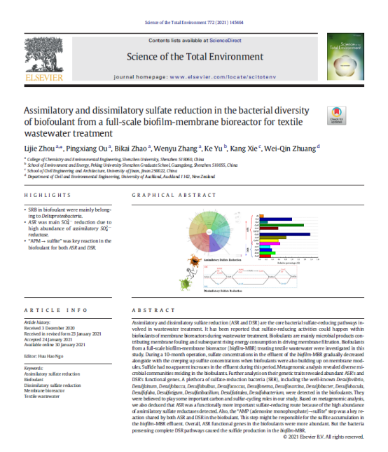 近日,深圳大学化学与环境工程学院周礼杰老师团队在期刊《Science of the Total Environment》(影响因子6.551,中科院JCR 1区, TOP期刊)上发表了题为《Assimilatory and dissimilatory sulfate reduction in the bacterial diversity of biofoulant from a full-scale biofilm-membrane bioreactor for textile wastewater treatment》的论文。周礼杰为此论文第一作者和通讯作者,深圳大学为第一单位。