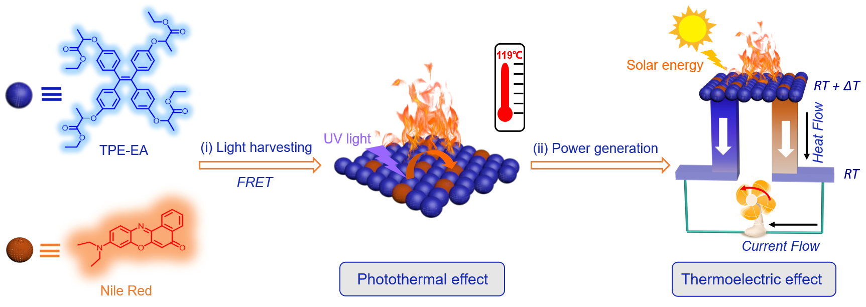 图1. 高效的液体AIE/尼罗红FRET体系实现光-热-电能量的连续转换。