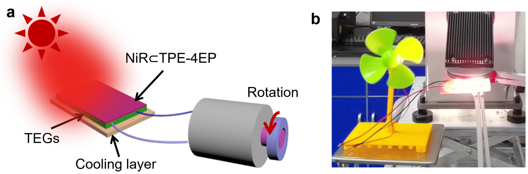 图2. 光-热-电驱动电机示意图(a)及实物图(b)。