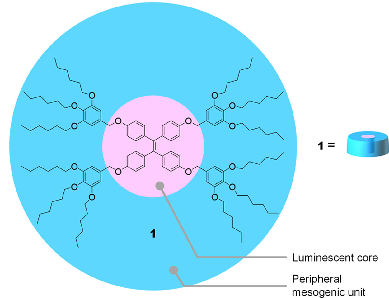 本文巧妙地将聚集诱导发光(AIE)的概念与液晶相结合,合成出一种具有类盘状结构的室温发光液晶分子1(如图1所示)。与大多数盘状液晶材料不同,类盘状结构的分子1在室温附近形成的盘状向列相液晶有助于解决棒状液晶分子的视角缺陷。此外,AIE特性赋予了这种材料良好的发光性能:在本体状态下,该物质可发出460 nm左右的天蓝色荧光,且液晶态发光量子效率高达49%。这种室温类盘状发光液晶为显示器部件提高能量利用率提供了一种可能的方案。