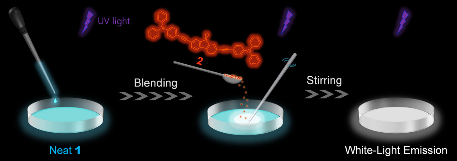 该物质的室温向列相液晶赋予了材料良好的流动性,可以作为有机溶剂溶解实验室合成的发红光的有机染料分子(如图2所示)。光谱实验表明:随着红光染料掺杂比的逐步提高,混合物的发光颜色可逐渐从发蓝光经由发白光最终变为发橙红光。可喜的是,这种混合物即便放置半年也不会出现明显的相分离,在大面积显示设备制造领域具有更光明应用前景。
