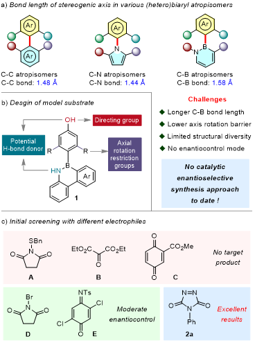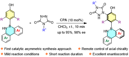 轴手性分子骨架作为手性分子的一类,其结构单元广泛存在于天然产物中, 并且在不对称催化、材料科学和药物化学等领域也应用广泛。近年来,轴手性化学领域获得了迅速发展,但是碳-杂原子轴手性领域进展缓慢。种类多样性的限制,制约了其在不对称催化、医药以及材料化学等领域的进一步应用开发。