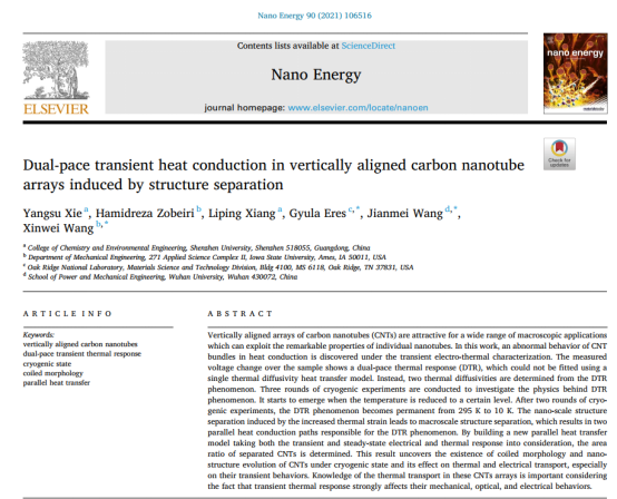 近期,深圳大学谢杨苏助理教授课题组与美国爱荷华州立大学、橡树岭国家实验室、武汉大学合作,在《Nano Energy》(影响因子17.881,中科院JCR工程技术一区,TOP期刊)上发表最新研究进展,题目为《Dual-pace transient heat conduction in vertically aligned carbon nanotube arrays induced by structure separation》。该论文第一作者为谢杨苏助理教授,通讯作者为爱荷华州立大学王信伟教授、橡树岭实验室Gyula Eres博士、武汉大学王建梅副教授,参与者还包括爱荷华州立大学王信伟教授课题组的博士生Hamidreza Zobeiri,深圳大学谢杨苏课题组的硕士生向丽平,深圳大学为第一完成单位。