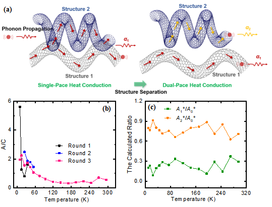 图 3.(a) 两种不同形貌的碳纳米管随温度下降而结构分离过程示意图。(b) A/C 的比率和 (c) 计算的两种不同 CNT 的归一化面积的比率,用于进一步分析纳米级结构分离。
