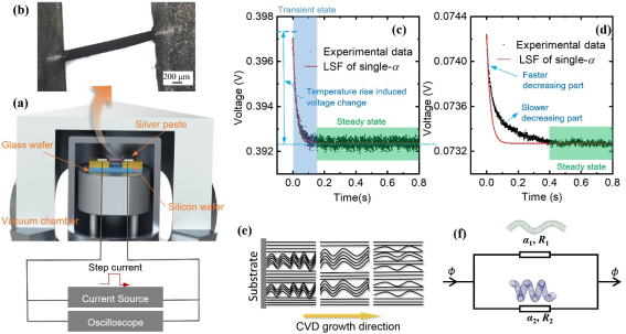 图 2.(a) TET实验装置示意图。(b) 光学显微镜下悬空的CNT束样品。(c) TET测量的第一轮低温实验中,样品在295 K下的典型V-t曲线。基于单一热扩散系数模型,它可以准确的拟合实验曲线。(d) 出现DTR现象的V-t曲线之一,基于单一热扩散系数模型,已无法拟合整个实验曲线。(e) 宏观CNT形态的示意图,由于集体生长和空间限制的竞争因素,其中一些最初直形的CNT发展成卷曲形态。(f) VACNT阵列中的并联传热模型的示意图。