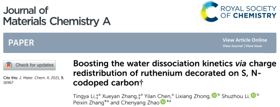 近日,深圳大学化学与环境工程学院赵辰阳副研究员团队在期刊《Journal of Materials Chemistry A》(影响因子12.732,中科院JCR1区,TOP期刊)上发表了题为《Boosting the water dissociation kinetics via charge redistribution of ruthenium decorated on S, Ncodoped carbon》的研究论文。深圳大学为第一通信单位。