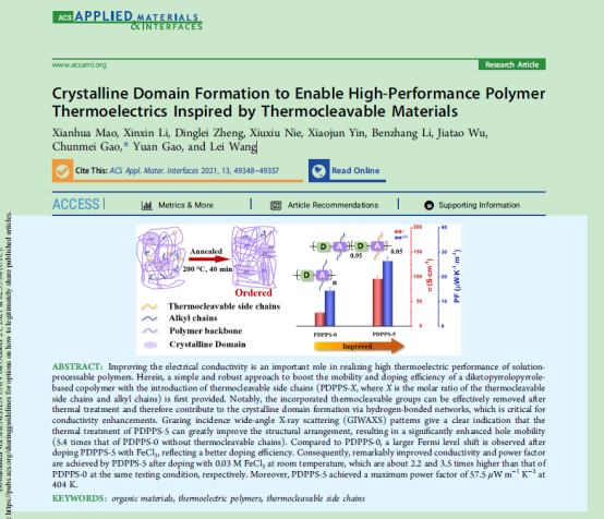 1) 将可移除侧链引入共轭聚合物,增强了材料的热电性能。