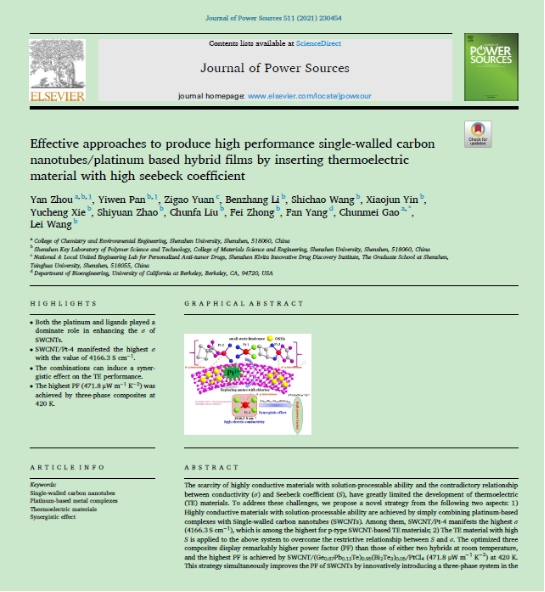 2)将铂类配合物引入碳纳米管,研究了配体结构对复合材料热电性能的影响,其中SWCNT/Pt-4展现了高的导电性,并制备了高性能的 SWCNT/(Ge0.87Pb0.13Te)0.95(Bi2Te3)0.05/PtCl4复合热电材料。在期刊《Journal of Power Sources》(影响因子9.127,中科院JCR1区, TOP期刊)上发表题为《Effective approaches to produce high performance single-walled carbon nanotubes/platinum based hybrid films by inserting thermoelectric material with high seebeck coefficient》。该课题组博士后周燕(出站)为第一作者,高春梅老师为通讯作者。深圳大学化学与环境工程学院为唯一通讯单位。