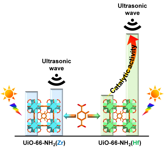 针对这一重要问题,深圳大学何传新课题组选择同构的UiO-66-NH2(Zr)和UiO-66-NH2(Hf)两种MOFs开展研究。在各项表征中,两种MOFs的结晶度、紫外吸收曲线、亲水性、载流子分离效率等各项性质都保持高度一致。尤其是比表面积、孔径分布、形貌、粒径等方面的一致,最大限度地保证了两种MOFs在传质上的一致,排除了干扰因素。两者金属氧簇的不同导致UiO-66-NH2(Hf)的压电效应远大于UiO-66-NH2(Zr),因此UiO-66-NH2(Hf)的压电光催化产氢活性约为UiO-66-NH2(Zr)的2.2倍。鉴于两种MOFs具有相同的理化性质,尤其是相同的结构、孔隙特征,超声波对反应体系中传质的加速作用应当是一致的,即大幅提高的活性应被毫无疑问地归因于UiO-66-NH2(Hf)更高的压电响应。本工作不仅是MOFs在压电光催化中的首次报道,也是明确说明压电效应对压电材料光催化活性贡献的首次研究。
