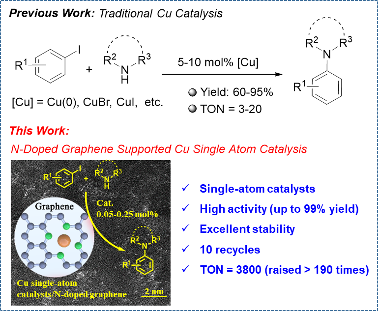 含氮化合物在医药、农业、材料等领域有重要的作用,利用C–N键的形成构建含氮化合物是非常重要的手段之一。在芳基碘和烷基胺反应的C–N构建中,通常使用的铜催化剂为Cu粉、CuI、CuBr、Cu2O等,其中均相催化过程效率高,但是面临催化剂流失、分离、重复使用的难题,而非均相催化会大大降低原子利用率。单原子催化作为连接均相催化与非均相催化的桥梁,在催化过程中,既能保证催化剂100%原子利用率和高活性,又具有稳定性好、易循环利用等优势,已经引起了科学家的广泛关注。