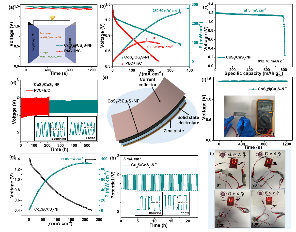 该工作通过静电纺丝结合高温热处理的方式制备得到多孔碳材料为载体,负载CoS2/Cu2S的p-n异质结金属硫化物颗粒作为高效双功能电催化氧反应催化剂,应用于可充式固态锌-空气电池中。优化后的CoS2/Cu2S-NF具有出色的双功能电催化氧反应(ORR和OER)性能。在半电池电催化氧反应测试中,CoS2/Cu2S-NF有着较小的电位差(△E=0.71 V), 将该材料应用于水系锌-空气电池,其最大功率密度为260.60 mW cm-2, 耐久可达580 h。全固态锌-空气电池最大功率密度和耐久分别为92.06 mW cm-2和23 h。