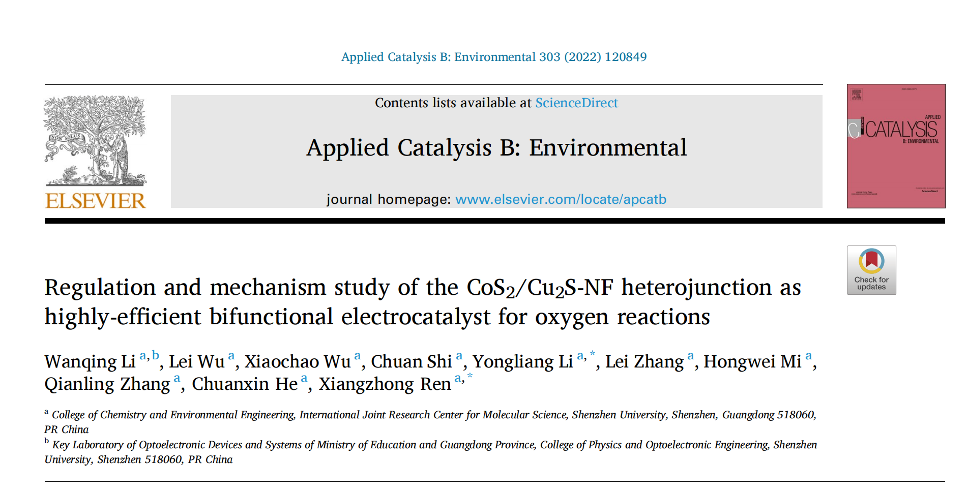 近日,深圳大学化学与环境工程学院任祥忠教授团队在期刊《Applied Catalysis B: Environmental》(影响因子19.503,中科院JCR1区,TOP期刊)上发表了题为《Regulation and Mechanism Study of the CoS2/Cu2S-NF Heterojunction as Highly-Efficient Bifunctional Electrocatalyst for Oxygen Reactions》的研究论文。该团队博士后李婉清为第一作者,任祥忠教授和李永亮特聘研究员为共同通讯作者,深圳大学为唯一单位和唯一通讯单位。