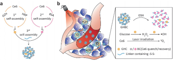 在本研究中,我们基于多级自组装策略构建了一种在肿瘤微环境下选择性产生ROS的蛋白纳米药物GHBC。首先,基于交联和分子自组装,获得了酶GOx、HRP和光敏剂Ce6自组装纳米颗粒GHC,以及血清白蛋白BSA和Ce6自组装纳米颗粒BC。GHC表现出超高的GOx-HRP级联酶活性,而且GHC和BC均实现了疏水光敏剂Ce6的负载。接下来,基于纳米颗粒自组装,GHC通过还原敏感连接物被BC封装,形成最终的GHBC,这不仅避免了GOx-HRP级联酶暴露在正常组织中,还加重了光敏剂Ce6的聚集诱导猝灭效应、降低了皮肤的光毒性。更重要的是,一旦被瘤内还原微环境触发,GHBCNPs解体释放聚集效应,暴露GOx-HRP级联酶和恢复Ce6的光敏性,从而分解肿瘤内葡萄糖生成细胞毒性的•OH和响应外部激光照射产生1O2,实现肿瘤特异性化学动力学-光动力学联合治疗。这项研究工作为新型纳米药物设计和更精确的癌症治疗提供了新思路。