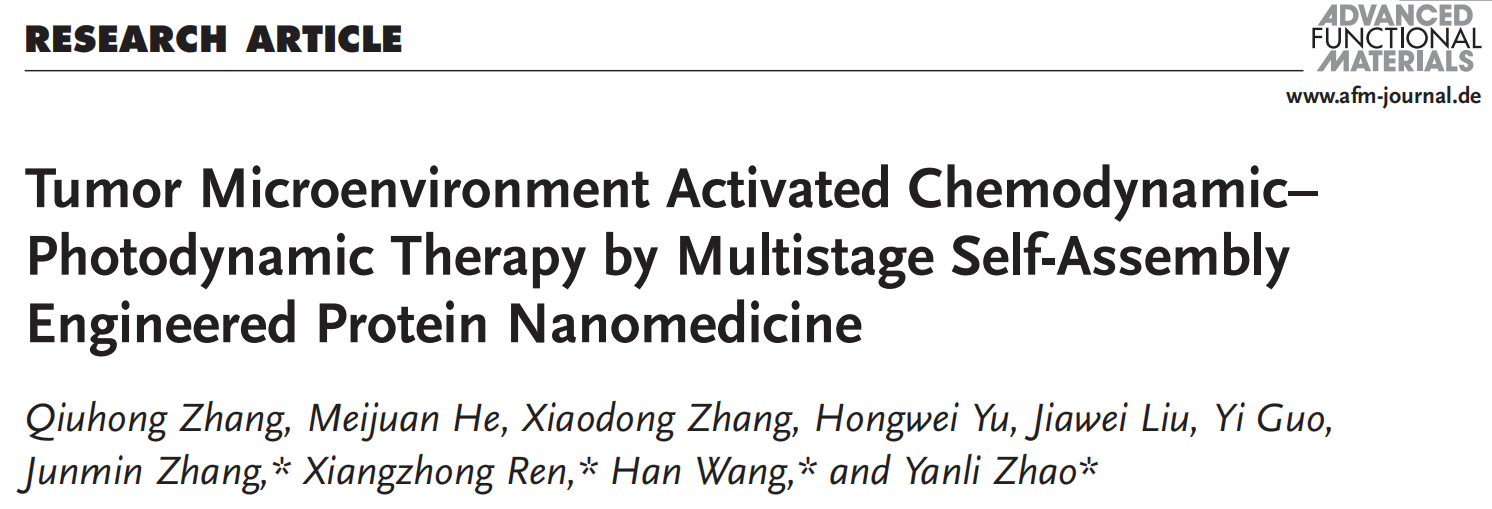 近日,深圳大学化学与环境工程学院任祥忠教授团队在材料领域顶尖期刊《Advanced Functional Materials》(影响因子18.808,中科院JCR 1区,TOP期刊)发表了题为《Tumor Microenvironment Activated Chemodynamic-Photodynamic Therapy by Multistage Self-Assembly Engineered Protein Nanomedicine》的研究论文。深圳大学张秋红博士后和上海交通大学贺美娟博士为共同一作,深圳大学任祥忠教授和张俊民副教授、上海交通大学王悍教授、南洋理工大学Yanli Zhao教授为该论文共同通讯作者,深圳大学为第一作者单位和第一通讯单位。