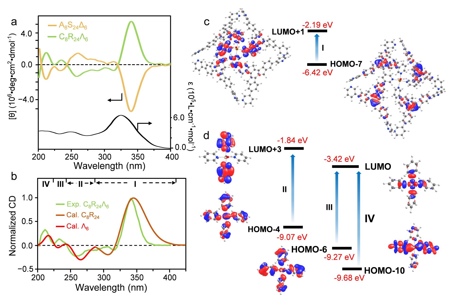当C3对称性的结构基元在立体结构中翻转受限时,其将具有顺时针(C)或逆时针旋(A)的手性。因而,本研究利用具有C3h对称性的Truxene为面构筑的超分子八面体,理论上具有22种同分异构体。实验结果显示超分子手性复杂程度远超预期。晶体结构显示,每个分子均具有三重层次的手性,包括Truxene的面手性(planar chirality, C/A),吡啶与Truxene间的轴手性(axial chirality, S/R),及吡啶与金属配位位点的螺旋桨状手性(propeller chirality, Λ/Δ)。然而在众多可能的手性组合中,晶体中仅有全同手性(homochiral)的一对外消旋体(C8R24Λ6与A8S24Δ6)。