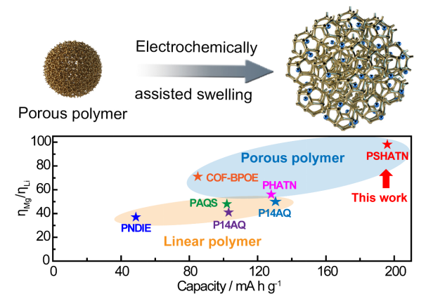 /Li)和196 mAh g−1的可逆储存容量。通过电化学阻抗测试、原位光学显微技术测试等方法,证明了PSHATN电极容量与其电化学溶胀过程具有强相关性。通过与线性聚合物电极PAQS和PNDIE进行比较研究,证明了线性聚合物不充分的电化学溶胀过程是限制离子传输和材料利用率的关键。相比于易于链段缠结的线性聚合物和具有刚性骨架的COF孔状正极材料,柔性孔状聚合物PSHATN因具有大的孔径和柔性链而电化学溶胀更充分,其中的镁离子扩散系数达到10-9 cm2 s-1,比线性聚合物PAQS和PNDIE提升了一个数量级。该文章创新性地证明了聚合物电化学溶胀过程对于提升其中离子传输能力和提高材料利用率方面具有重要作用,为镁离子电池大规模储能应用奠定了基础。