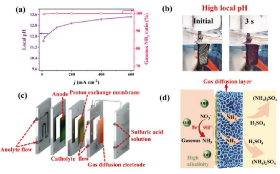 为了实现从硝酸盐中提取氨的电化学回收过程,除了快速生产氨外,从废水中高效捕获氨也很重要,但是相关的研究却很少。从废水中捕获氨的成熟技术,包括空气剥离和离子交换法,存在着成本高、难以持续捕获氨的问题。在这个工作中,我们设计了一种“二合一”流动电解槽,利用商业气体扩散电极将硝酸根还原电解室和氨捕获室合二为一,并进一步使用硫酸溶液捕集气态的氨,首次实现了氨生产和捕获的同步。值得注意的是,该电解槽可以使反应产生的产物氨快速地从三相反应界面转移到氨捕获室,促进平衡向产物的方向移动,促进反应的进行。通过高效电催化剂与“二合一”电解槽的结合,产氨的电流密度可以高达528 mA cm-2、氨捕获效率为90.4%。此外,我们对采用“二合一”电解槽处理废水进行了成本核算,发现成本远低于广泛使用的硝化/反硝化技术。值得注意的是,在我们体系中,去除1mol硝酸盐还可以生产0.5 mol的硫酸铵,这使得我们的“二合一”电解槽路线具有较好的应用前景。