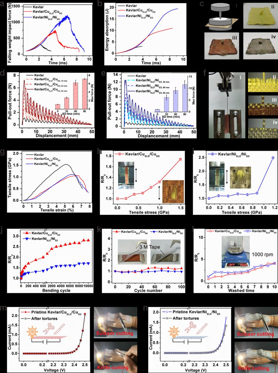 金属化处理之后凯夫拉织物的抗冲击性能大幅度增强,落锤冲击力增加了2~3倍。该金属化凯夫拉织物具有超高的机械强度和机械稳定性,拉伸强度达到1 GPa以上,而且拉伸断裂应变小,在受到拉伸、弯曲、胶带粘揭、洗涤、刀划、刀刺、剪刀剪等破坏后的导电性依然保持良好的导电性(图2)。
