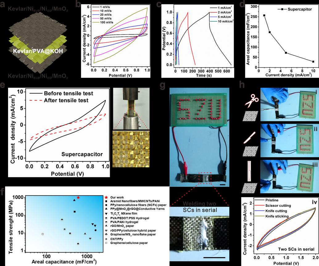 得益于该金属化凯夫拉织物优异的导电性、机械强度和机械稳定定性,可以被应用为高强度的柔性导体。基于镀镍凯夫拉织物优异的热稳定性和阻燃性,成功应用于柔性高温热电热器,仅需接通3.5 V的直流电,该电热器的表面达到接近300 ℃的高温,电热器表面的工作温度基本与接通的直流电压呈线性关系(图4)。以镀镍凯夫拉织物作为集流体,通过电沉积二氧化锰制备的超级电容器电极在具有可观的单位面积容量(608.9 mF cm-1),同时还能承受GPa级别的拉伸强度和各种机械破坏(图5)。
