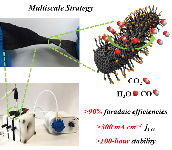 引入多尺度合成策略,得到了一种具有多级结构的碳纤维负载钴纳米颗粒(Co/CNT/HCNF)。其碳纳米管结构可将钴颗粒的直径限制到几纳米,并防止纳米颗粒被电解溶液刻蚀。这些交联的碳纳米纤维最终形成几十平方厘米的纤维膜,可以直接用作流动池装置中的气体扩散层。Co/CNT/HCNF膜产生CO的法拉第效率高于90%,部分电流密度大于300mA cm−2,同时具有至少100小时稳定性。相关研究内容以“A Multiscale Strategy to Construct Cobalt Nanoparticles Confined within Hierarchical Carbon Nanofibers for Efficient CO2 Electroreduction”为题发表于Small (影响因子15.153,中科院1区)。我院解来勇博士后为第一作者,我院教师杨恒攀研究员与何传新教授为通讯作者。