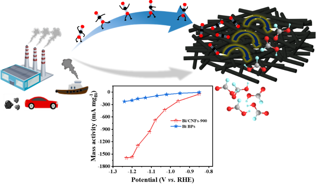 使用经济可行且适用于大规模生产的策略,制备了一种碳层封装的超小Bi纳米颗粒催化剂。碳纤维对Bi纳米颗粒的迁移起到一定的限制作用,同时大大降低了金属的实际负载量;Bi与周围的碳层存在静电相互作用,可以有效地降低界面电荷的转移电阻,促进电子的快速转移;碳纤维的限域作用也有效地抑制了催化反应过程中Bi纳米颗粒的聚集,使催化剂具有良好的稳定性。相关研究内容以“Boosting Electrocatalytic CO2 Reduction to Formate via Carbon Nanofiber Encapsulated Bismuth Nanoparticles with Ultrahigh Mass Activity”为题发表于Chinese Journal of Catalysis(影响因子12.920,中科院1区)。中科大联培博士生孔艳为第一作者,我院教师杨恒攀研究员与何传新教授为通讯作者。
