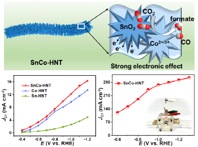 通过静电纺丝结合热氧化处理技术,制备了具有强电子效应的一维锡钴双金属氧化物。其多级结构可产生更多的活性位点和孔容量,从而增加催化内在活性和CO2吸附能力。此外,Sn活性中心的电子缺失增强了CO2还原过程中对关键中间体的电子亲和力,Co2+/3+的可逆转移提高了整个结构的导电性。因此,SnCo-HNTs可以在宽的电位窗口下表现出优异的CO2电还原催化活性。相关研究内容以“A Hierarchically Structured Tin-cobalt Composite with an Enhanced Electronic Effect for High-performance CO2 Electroreduction in a Wide Potential Range”为题发表于Journal of Energy Chemistry(影响因子13.599,中科院1区)。我院蒋兴星博士后为第一作者,我院教师杨恒攀研究员与何传新教授为通讯作者。