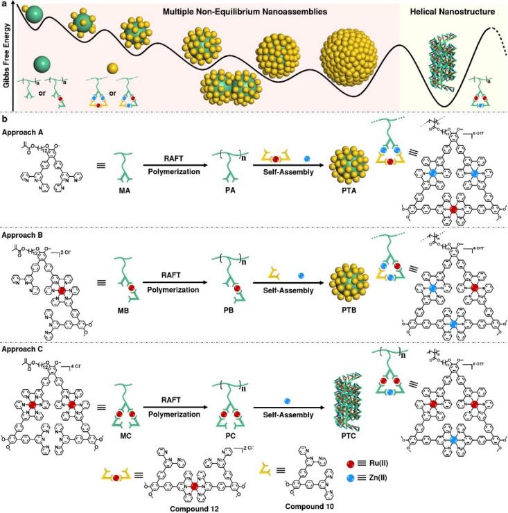 该研究将三联吡啶基三角形配位超分子的构筑模块通过可逆加成-断裂链转移(RAFT)聚合连接到了聚合物链上,得到了三种主链相同而侧基不同的窄分布聚合物(图1)。基于形状互补策略,理论上侧基可以进一步与其互补成分进行配位驱动自组装形成热力学稳定的三角形配位超分子。然而,聚合物链的限域效应大大延缓了配位驱动自组装速率,最终使作者成功地观察和捕获到了一系列处于非平衡态的荔枝状纳米结构(图2)。作为对照,聚合物链对方法C中尺寸较小的互补成分锌离子的限制较弱,导致其侧基可以快速地形成三角形配位超分子。受体积位阻和静电排斥双重影响,三角形配位超分子沿聚合物主链螺旋排列(PTC)。
