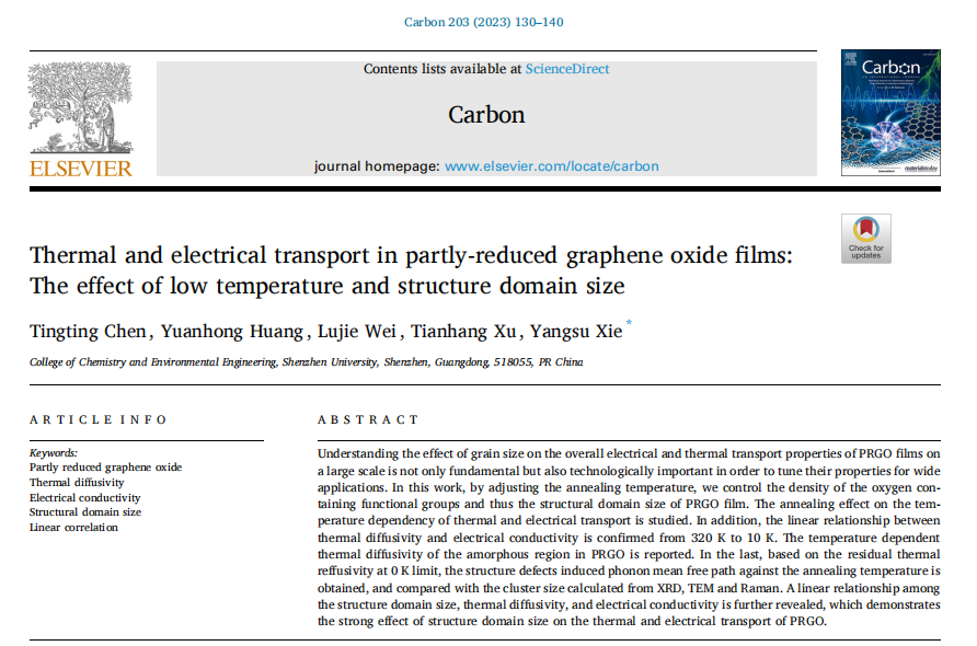 近期,深圳大学化学与环境工程学院谢杨苏助理教授课题组在《Carbon》(影响因子11.307,中科院JCR工程技术一区,TOP期刊)上发表最新研究进展,题目为《Thermal and electrical transport in partly-reduced graphene oxide films: The effect of low temperature and structure domain size》。该论文第一作者为硕士研究生陈婷婷,通讯作者为谢杨苏特聘副研究员,深圳大学化学与环境工程学院为第一完成单位和通讯单位。