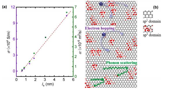 图 2. (a)在295 K时,α、σ与结构域尺寸的线性关系。(b) PRGO中sp2域和sp3非晶域结构中的电子跳跃和声子传播机制示意图。
