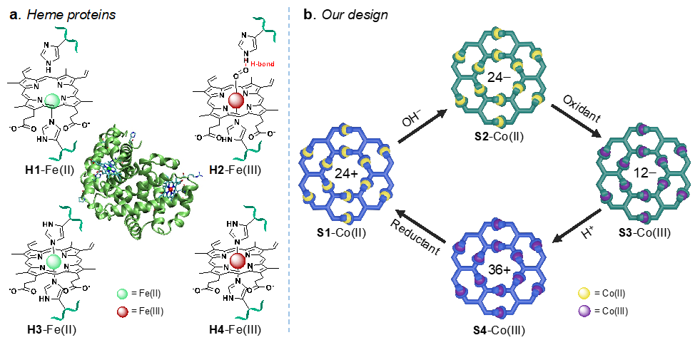 图1.(a)血红蛋白的四种代表性状态;(b)本工作设计的pH/氧化还原刺激响应性配位超分子四种状态间的转换