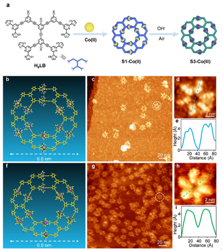 图2.(a)超分子配位组装及原位脱氢-氧化过程;(b-i)超分子的结构模型及STM可视化表征