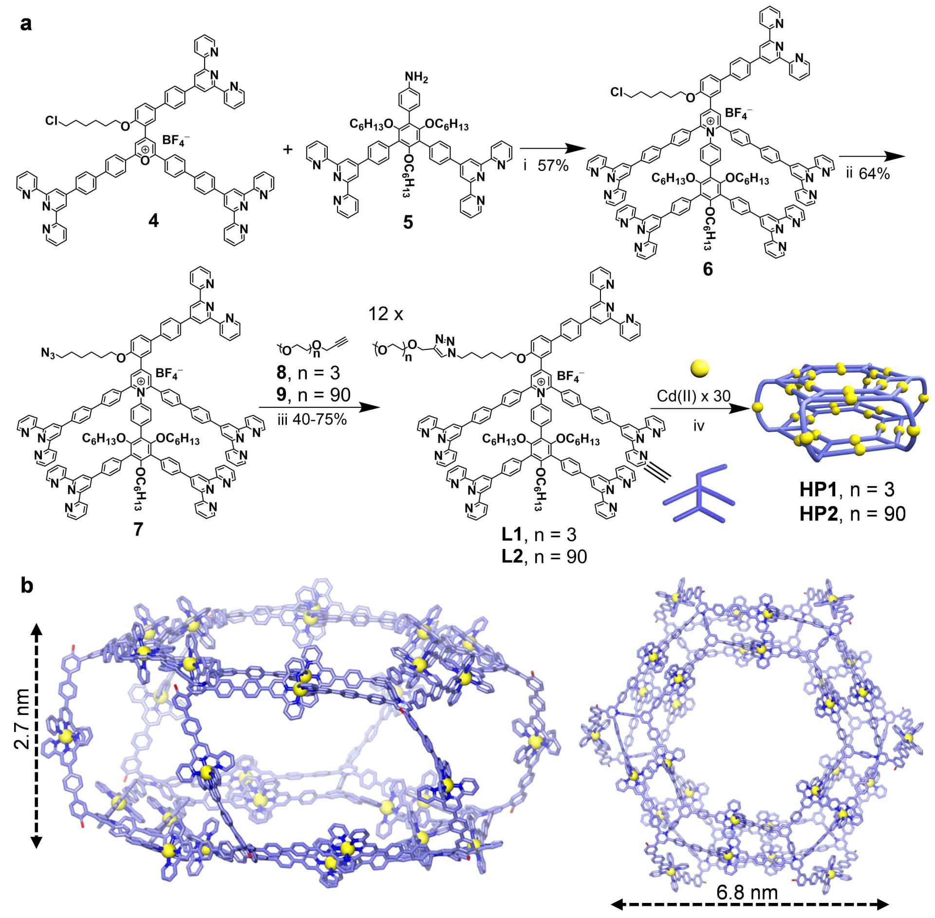 该研究在五臂三联吡啶配体中引入聚乙二醇链,通过配位自组装构筑了水溶性的六棱柱形配位超分子笼(图1)。该超分子笼具有巨大的疏水空腔(模拟结构表明该空腔可容纳直径最大约为5纳米的球体),利用超分子笼的亲疏水作用可高效地实现对量子点的包结(图2)。荧光发射光谱和透射电子显微镜结果均表明,超分子笼实现了对量子点的尺寸筛选及包结(尺寸约为2-5纳米)。主客体复合物进一步通过了紫外可见吸收光谱、核磁、动态光散射、原子力显微镜、扫描透射电子显微镜等手段确证。