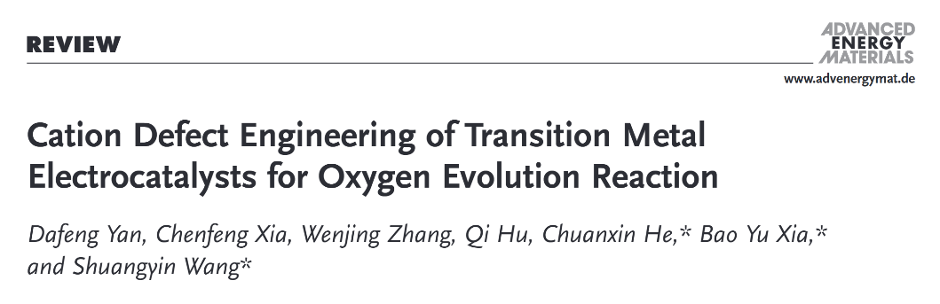 题为《Cation Defect Engineering of Transition Metal Electrocatalysts for Oxygen Evolution Reaction》的论文由团队严大峰博士后为第一作者,何传新教授、湖南大学王双印教授和华中科技大学夏宝玉教授为共同通讯作者,深圳大学为第一作者单位和第一通讯单位。