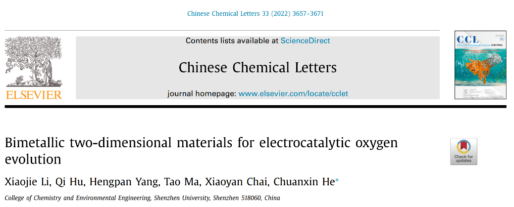 题为《Bimetallic two-dimensional materials for electrocatalytic oxygen evolution》的论文由团队李小杰博士后为第一作者,何传新教授为通讯作者,深圳大学为唯一作者单位和唯一通讯单位。