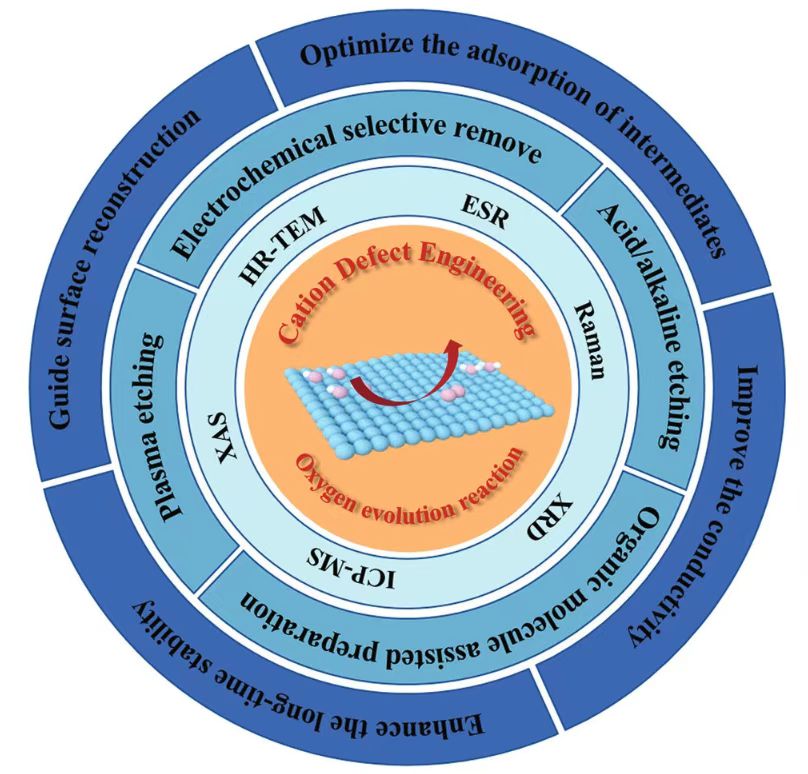 氧气析出(OER)是电解水制氢和金属空气电池等能源存储与转换器件中的重要半反应。OER过程是一个多步、多电子过程,其反应动力学缓慢,很大程度上限制相关能源存储与转换器件的转换效率。因此,亟需开发高效的电催化剂来克服OER的动力学能垒,进而降低能耗。最近,众多研究成果表明选择性地引入阳离子空位缺陷能够显著提升OER性能。