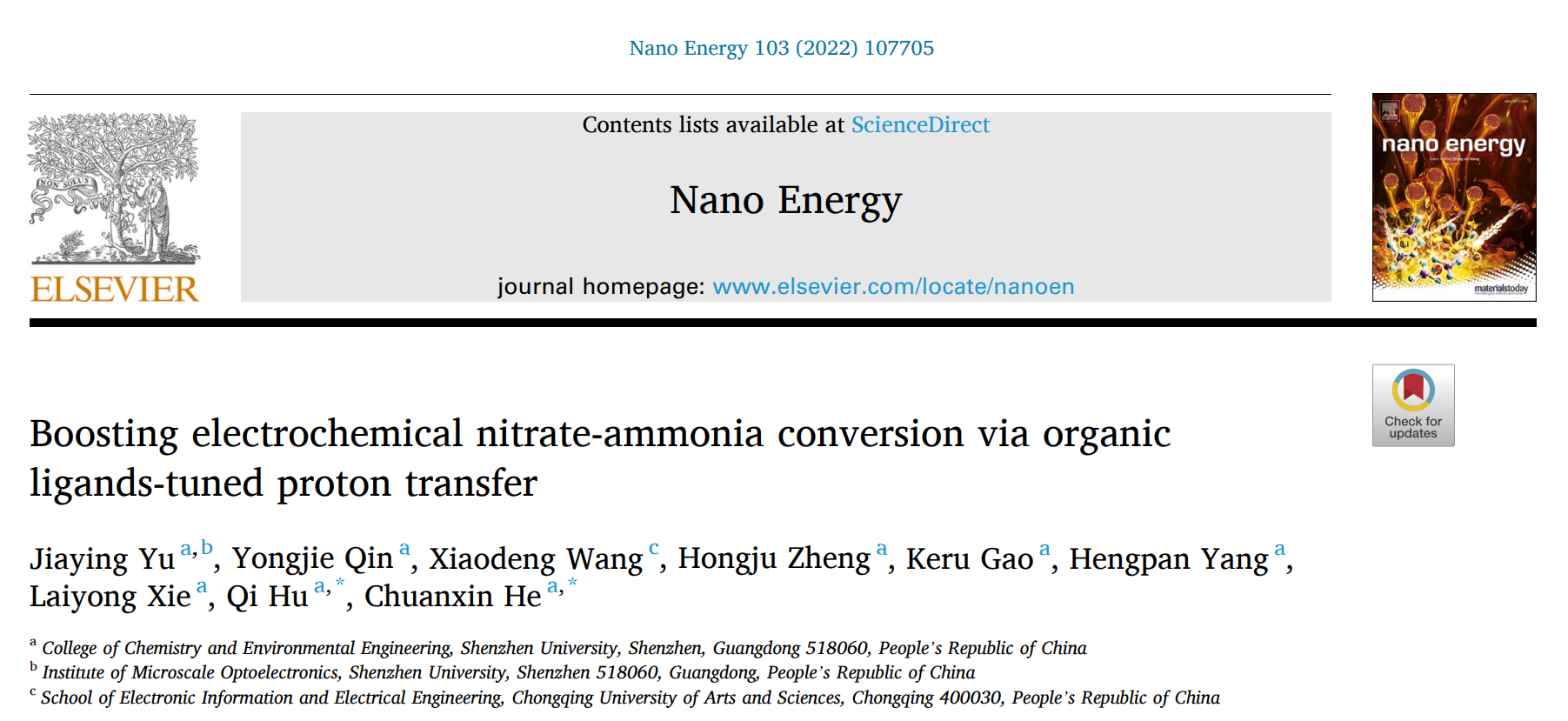 题为《Boosting electrochemical nitrate-ammonia conversion via organic ligands-tuned proton transfer》的论文由蔚佳莹博士后为第一作者,何传新教授和胡琪副教授为共同通讯作者,深圳大学为第一作者单位和唯一通讯单位。