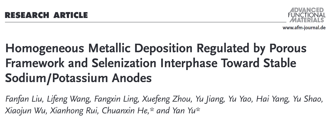 题为《Homogeneous Metallic Deposition Regulated by Porous Framework and Selenization Interphase Toward Stable Sodium/Potassium Anodes》的论文由团队刘凡凡博士后为第一作者,何传新教授和中国科学技术大学余彦教授为共同通讯作者,深圳大学为第一作者单位和第一通讯单位。