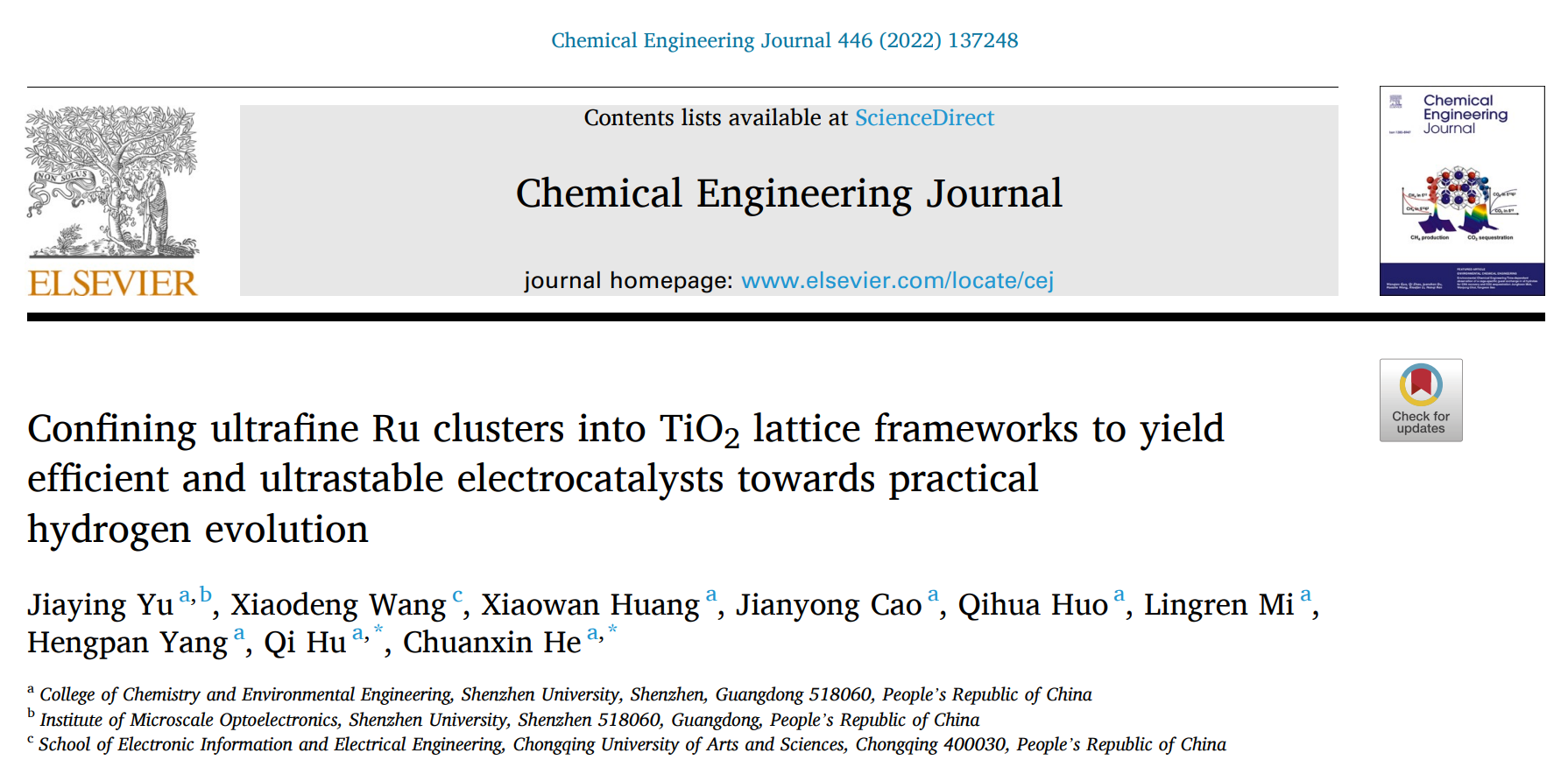 题为《Confining ultrafine Ru clusters into TiO2 lattice frameworks to yield efficient and ultrastable electrocatalysts towards practical hydrogen evolution》的论文由蔚佳莹博士后为第一作者,何传新教授和胡琪副教授为共同通讯作者,深圳大学为第一作者单位和唯一通讯单位。