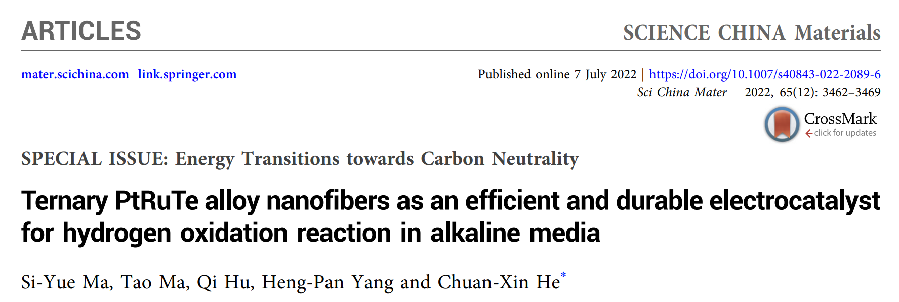 题为《Ternary PtRuTe alloy nanofibers as an efficient and durable electrocatalyst for hydrogen oxidation reaction in alkaline media》的论文由团队马思阅博士后为第一作者,何传新教授为通讯作者,深圳大学为唯一作者单位和唯一通讯单位。