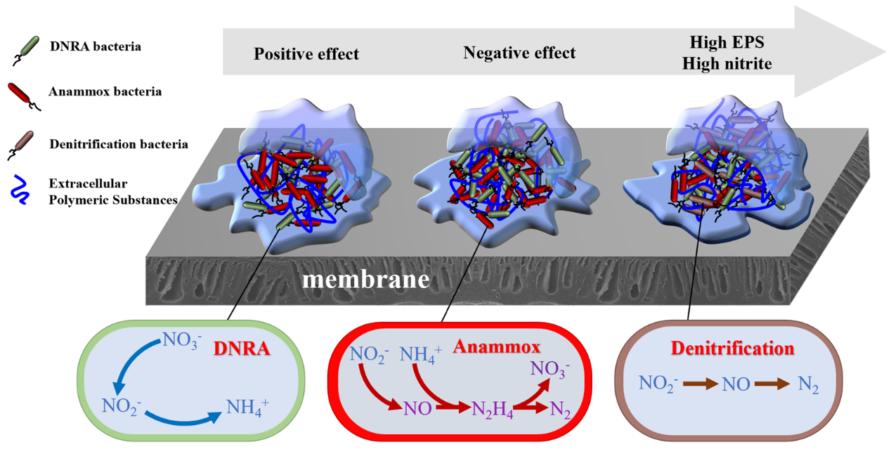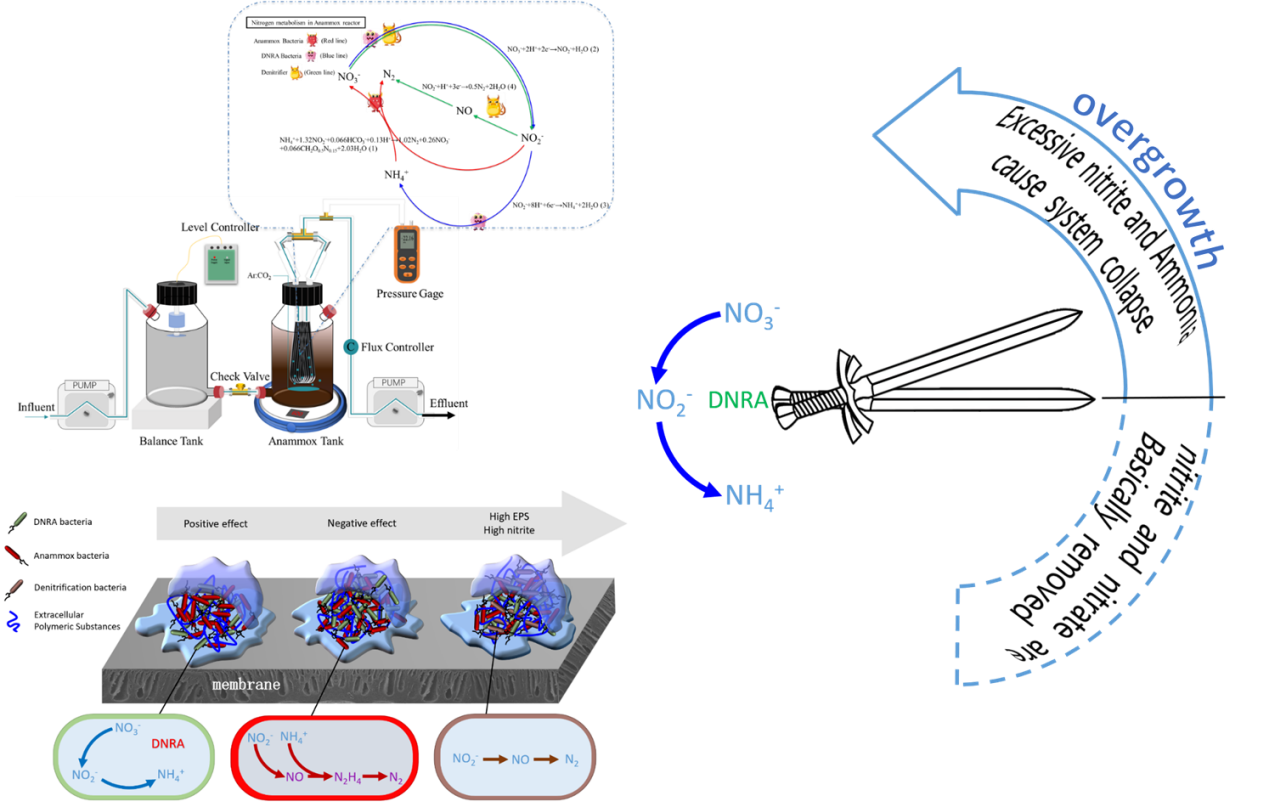 DNRA和反硝化过程的反硝化步骤(NO3- → NO2-)相同。这两种细菌都可以通过电子供体(例如有机碳)还原硝酸盐,从而向厌氧氨氧化细菌产生亚硝酸盐。两者主要的区别是DNRA细菌可以进一步将亚硝酸盐还原为铵,这是厌氧氨氧化细菌的另一种底物。而典型反硝化细菌将亚硝酸盐还原为氮气,被认为是厌氧氨氧化细菌亚硝酸盐的竞争对手。因此,DNRA被认为是厌氧氨氧化生物过程中硝酸盐产生亚硝酸盐和氨的可行机制,并已在各种生物反应器中使用厌氧氨氧化来增强厌氧氨氧化脱氮。