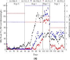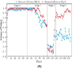 初始阶段,Anammox- MBR可以去除进水中95%以上的100mg /L NH4+-N和132mg /L NO2--N (NH4+-N:NO3--N = 0.76)。然后,通过亚硝酸盐冲击加载诱导系统崩溃恢复事件,以更好地了解厌氧氨氧化膜反应器中不同细菌之间的反应。在第一阶段的进水中使用相对较高的NO2--N浓度(100 mg/L)来模拟亚硝酸盐冲击加载场景。为此,将进水NH4+-N浓度提高到160 mg/L,对应比例为1.33 的NH4+-N:NO2--N,以抵消潜在的亚硝酸盐积累。有趣的是,厌氧氨氧化细菌的脱氮能力维持了约20天后才开始显著下降。在第二阶段,进一步将进水亚硝酸盐浓度提高到120 mg/L,以模拟短时间内的高亚硝酸盐毒性情景。正如预期的那样,脱氮效率降至16.8%。在诱导系统崩溃后,在比例为1.25 的NH4+-N:NO2--N和80 mg/L的低亚硝酸盐进水浓度下,Anammox- MBR的脱氮性能稳定恢复到93.2%。