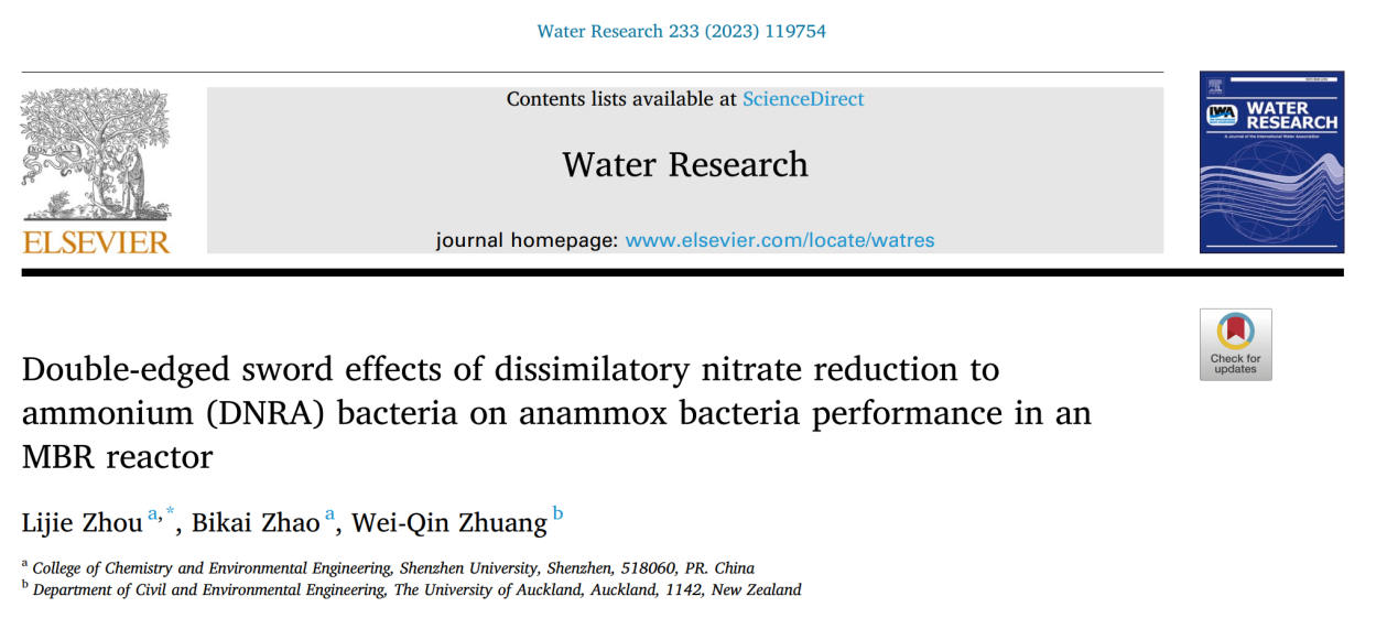近日,深圳大学化学与环境工程学院周礼杰副教授团队在期刊《Water Research》(影响因子13.40,中科院JCR 1区,TOP期刊)上发表了题为《Double-edged sword effects of dissimilatory nitrate reduction to ammonium (DNRA) bacteria on anammox bacteria performance in an MBR reactor》的研究论文。该团队周礼杰副教授为论文第一作者及通讯作者,深圳大学为第一作者单位及通讯单位。
