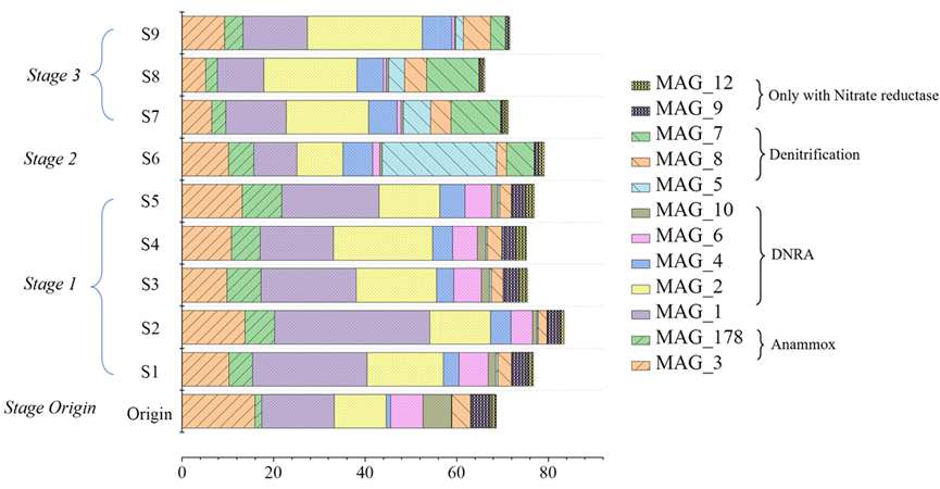 宏基因组分析显示,第一阶段中氮去除效率的下降可能是由于具有DNRA能力的细菌的过度生长。结果表明,在厌氧氨氧化膜反应器中,Ignavibacteriales(21.7%)的细菌数量超过了竞争的厌氧氨氧化菌(17.0%)。高NO2--N负荷(120 mg N/L)进一步导致占优势的Candidatus Kuenenia spp.被Brocadia Candidatus spp.取代。由此可见,在高比例的NH4+-N: NO2--N的进水情况下, DNRA细菌对厌氧氨氧化过程有明显的负面影响。当以120 mg/L NO2--N投加进Anammox- MBR (NH4+-N: NO2--N比例为1.33)时,反硝化细菌成为主要优势氮代谢种群,DNRA活性降低,厌氧氨氧化活性降低。它们可能以溶解了厌氧氨氧化氨和脱氧核糖核酸的微生物细胞为食。在第三阶段,采用低比例NH4+-N:NO2--N (1.25)和80 mg/L NO2--N的修复体系,有效促进具有DNRA活性的细菌生长。尽管厌氧氨氧化细菌在这一阶段的丰度仅为7.7%,但它们可以负责这一阶段约90%的总氮去除。
