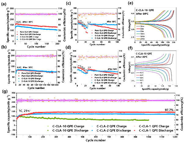 近日,深圳大学田雷&朱才镇&徐坚团队提出了一种策略,通过直接对醋酸纤维素(CLA)进行热成型来制备一种准固体的复合聚合物电解质来解决低离子传导率和聚合物电解质/电极不相容的问题。CLA上的乙酸酯(CH3COO-)打破了纤维素链之间巨大的氢键相互作用,提供了高速的Li+传输通道。通过与LATP结合,形成的复合电解质(C-CLA-10 QPE)显示出较高的Li+传输数(tLi+)=0.85,普遍高于大多数聚合物电解质。