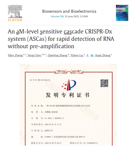 该成果以Short Communications的形式发表在生物传感和生物分析领域顶级期刊Biosensors and Bioelectronics(影响因子12.545,中科院一区,TOP期刊)上,题目名为“An aM-level sensitive cascade CRISPR-Dx system (ASCas) for rapid detection of RNA without pre-amplification”。深圳大学化学与环境工程学院20级硕士研究生张奕滨及陈勇副研究员为共同第一作者,刘翼振副教授为通讯作者,深圳大学为第一完成单位,全文链接见:https://www.sciencedirect.com/science/article/pii/S0956566323001902